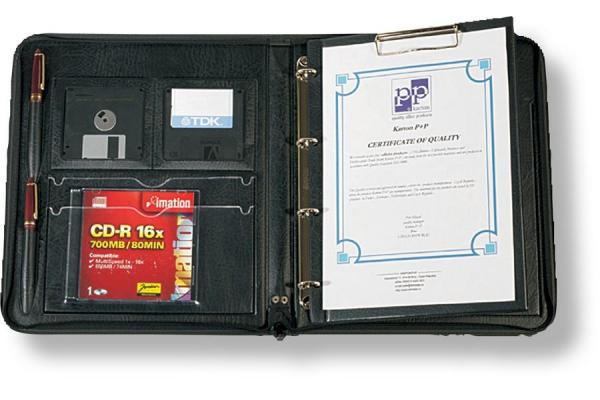 - Vybavení: klip na upevnění bloku, čtyřkroužková mechanika, kapsičky na tužky, vizitky, CD